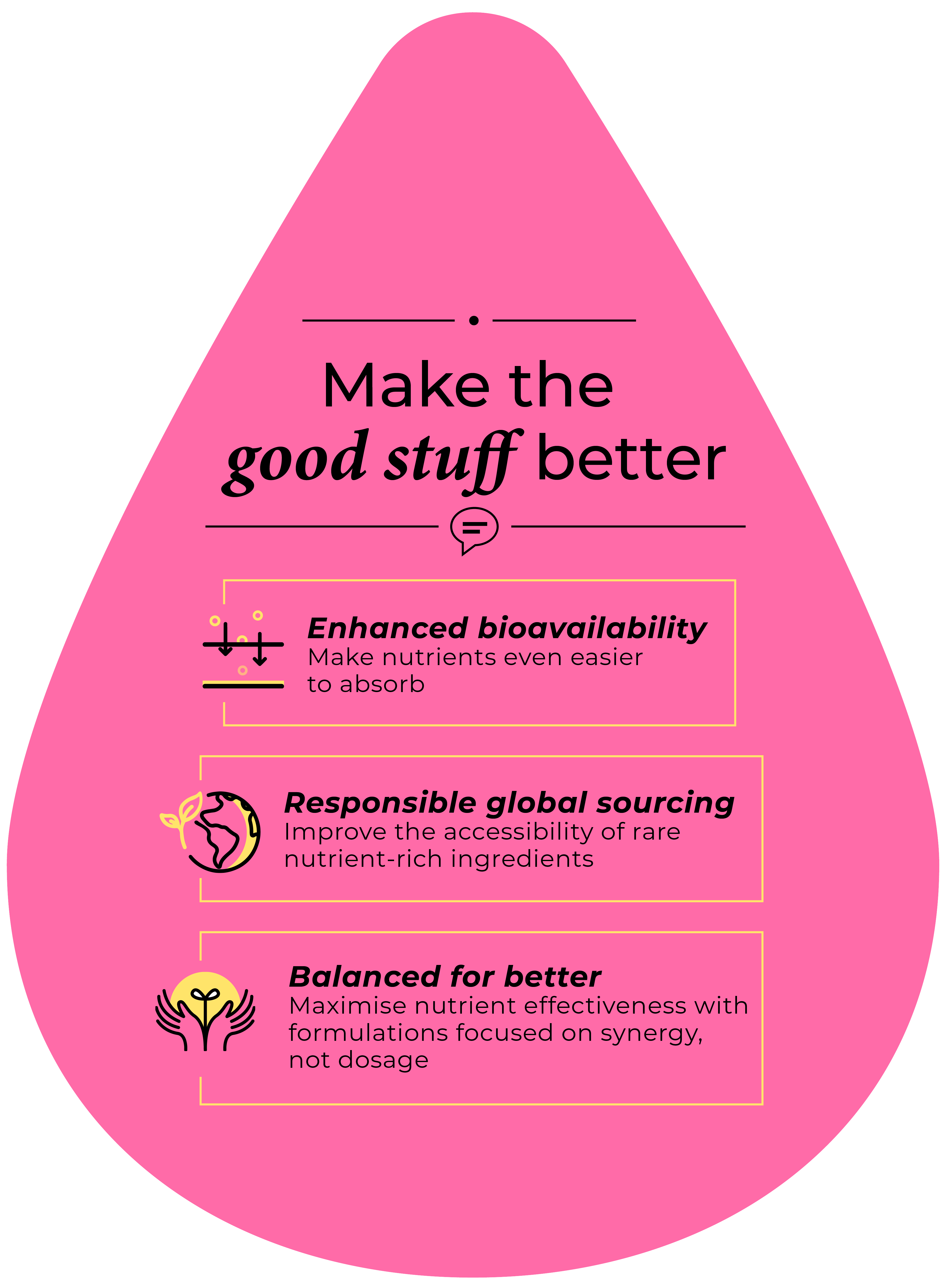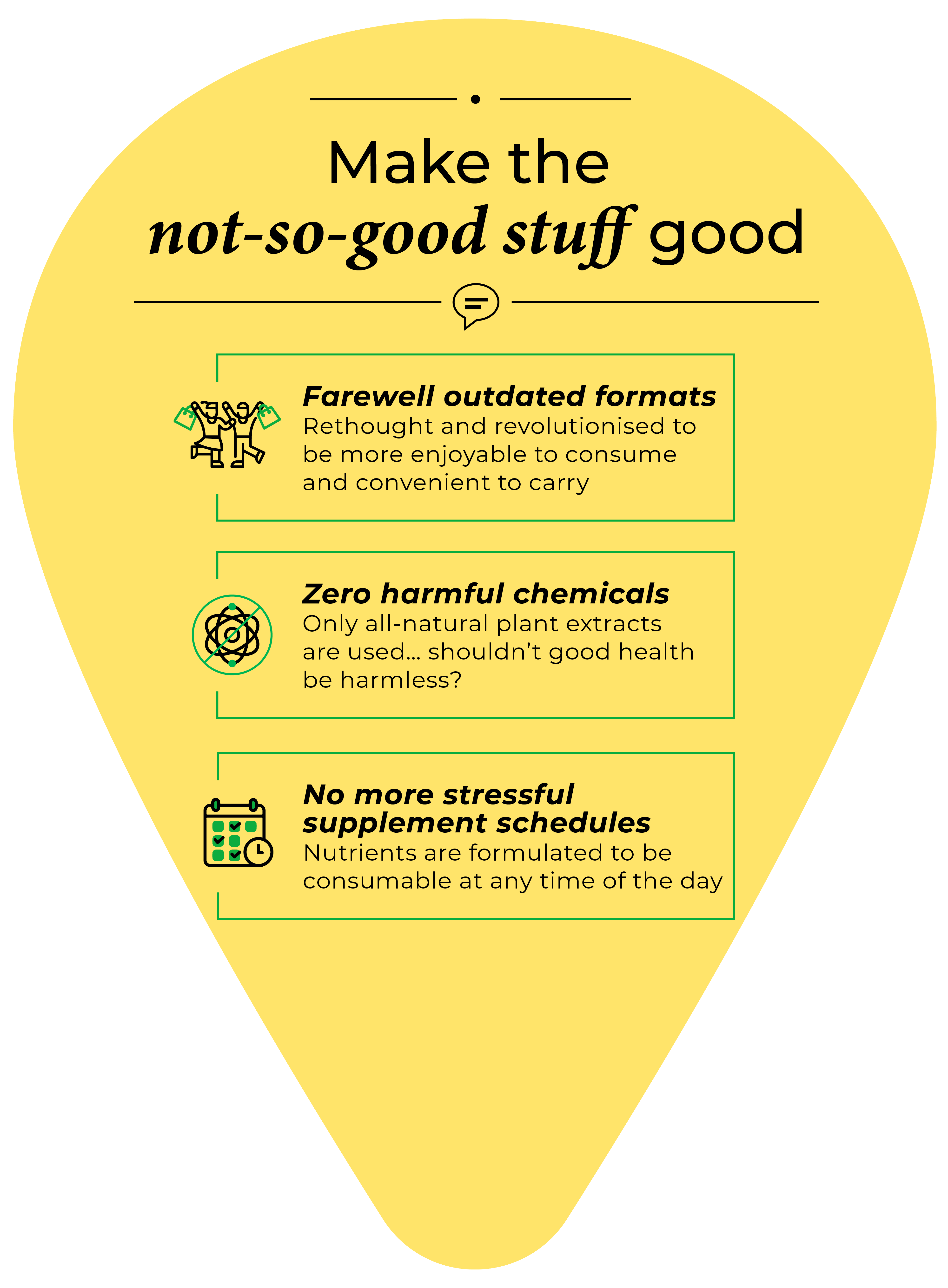 Like good food, our nutrients are made to not just be consumed but enjoyed as well. From beverage form to chewable tablets, we are revolutionising and optimising health supplements into delicious daily habits that anyone can love, based on insights harvested from our extensive database. Men and women. Old and young. Little children and big babies.