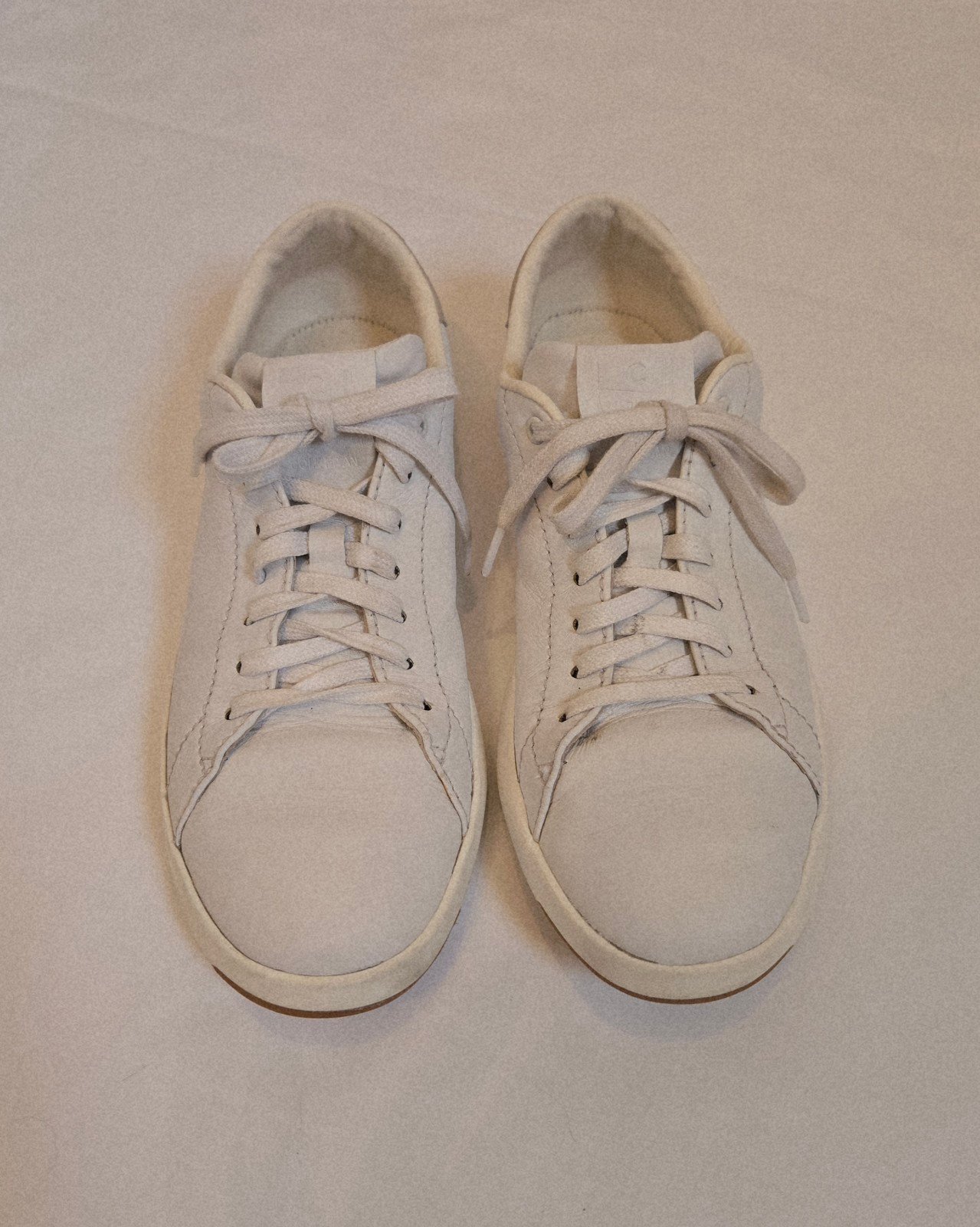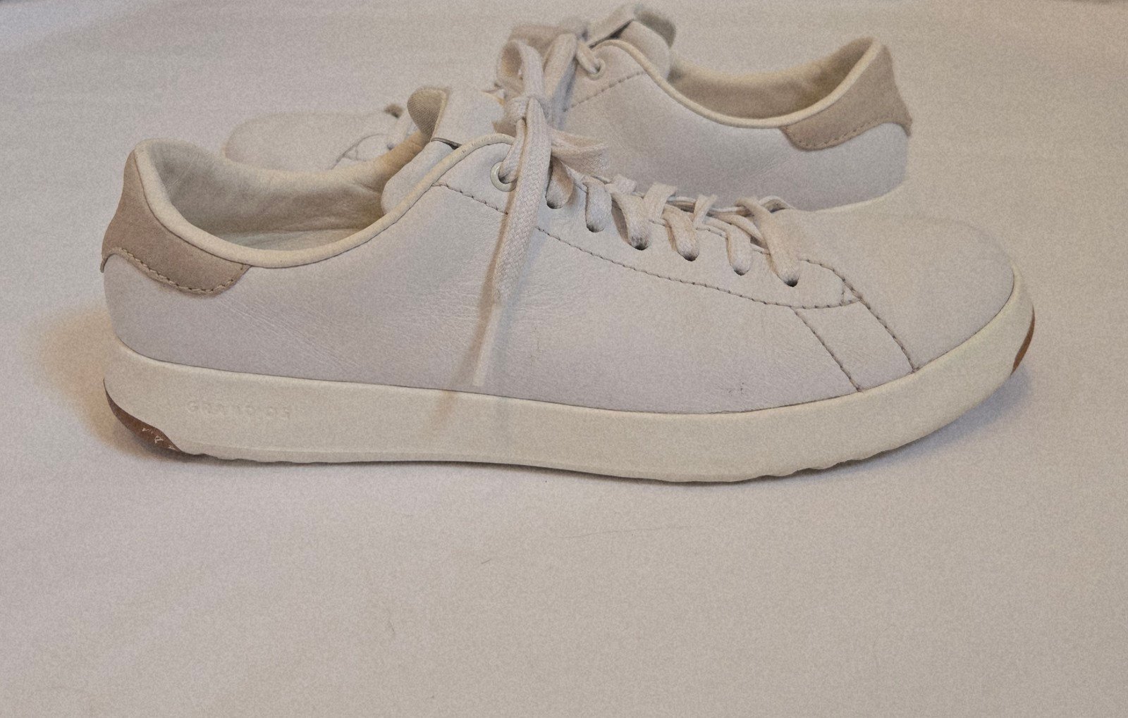 Cole Haan GrandPro Tennis sneaker in white leather. Women’s size 8.5. Clean minimalist silhouette with subtle suede heel accent, lace-up front, leather upper and rubber sole. Insole is cushioned for all-day wear. Excellent style with versatile neutral tone — great for casual, travel, walking, work-ready looks, athletic, athleisure, bohemian, etc. In good used condition. There's some light discoloring to the front outer trim and typical creases in the bend areas but nothing major (please review photos for condition).