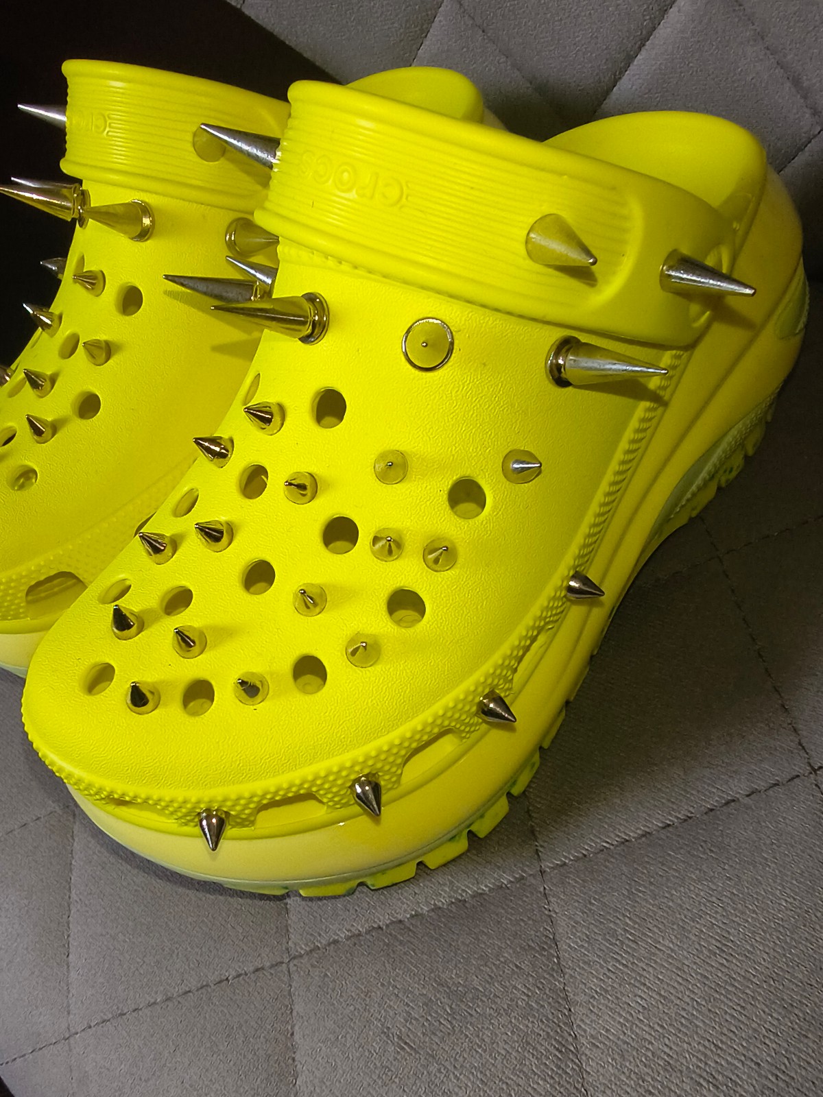 Only worn once. Super cute customized by me with screw on spikes. I've done this to plenty of my shoes and they do not come off. The only ones you would have to pop back on from time to time are the ones on the strap that you put behind your heel because they aren't screwed on they're just popped into the holes. I will include extra spikes for those just in case.