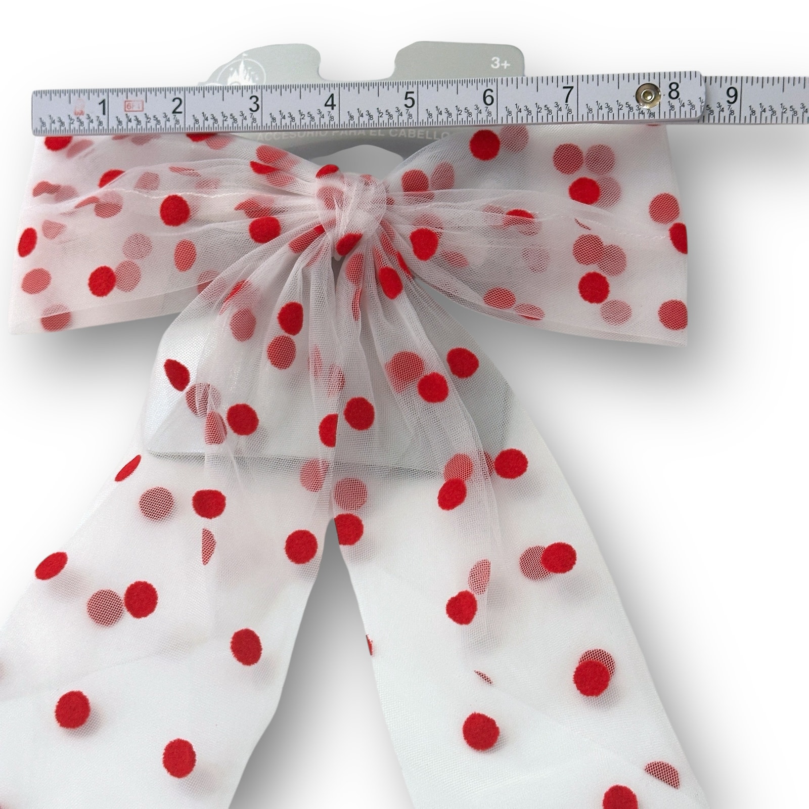 Add a touch of Disney magic to any outfit with this adorable Minnie Mouse hair clip! This NEW Disney Parks Red Polka Dot Minnie Mouse Bow Hair Accessory is perfect for girls of all ages. Bow is made of white sheer or mesh looking fabric with red polka dots, and has "Minnie Mouse" written on one of the tails