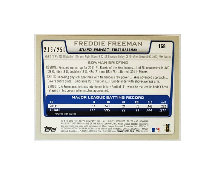 2012 BOWMAN #168 FREDDIE FREEMAN BASEBALL CARD!