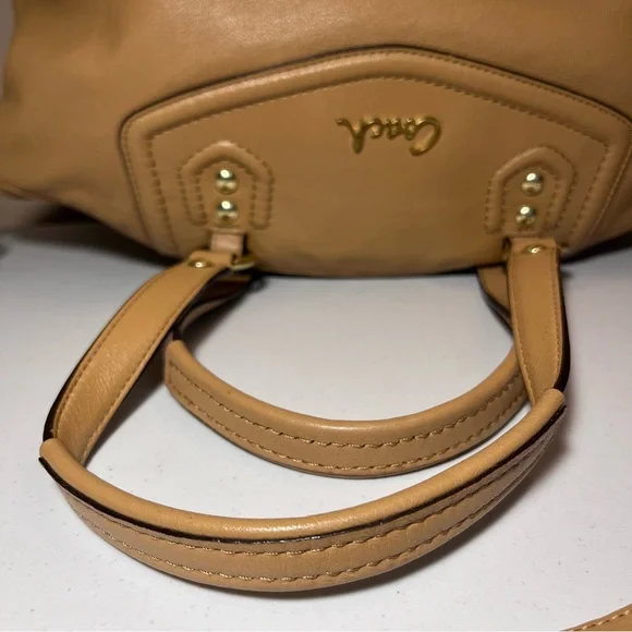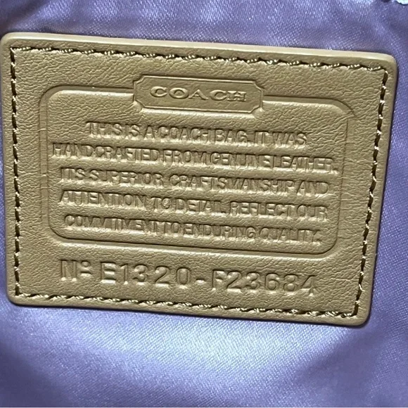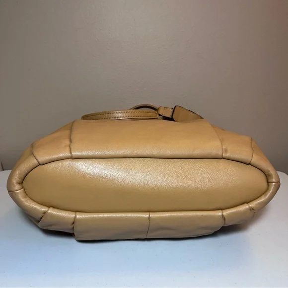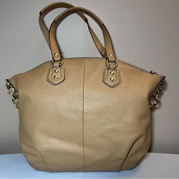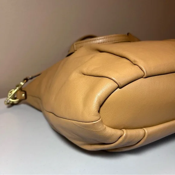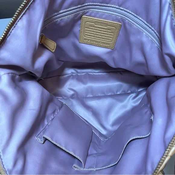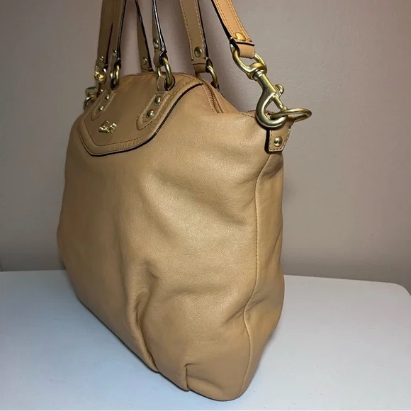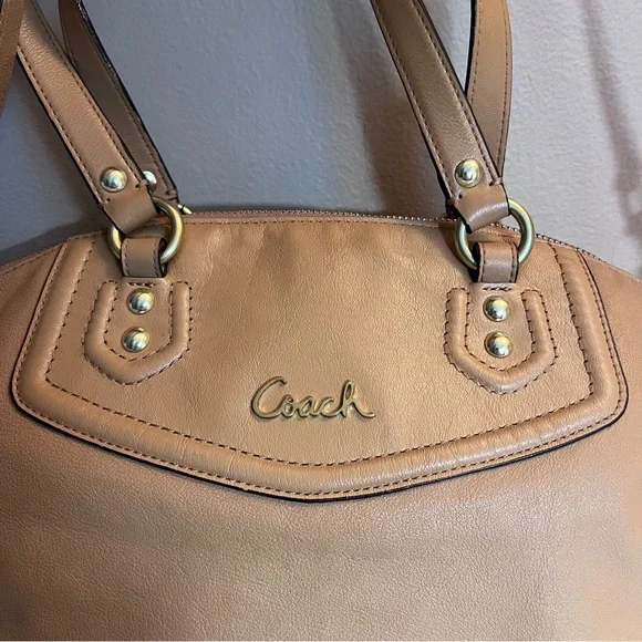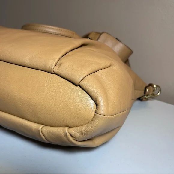 Coach Ashley North/South Leather Satchel Color: CamelLeather with gold tone hardware. Amazing buttery leather exterior and lavender sateen interior. Leather pleated on front & back. Top zip closure. Inside 2 Slip Pockets & 1 Zipper Pocket. Handles and Removable Strap. 13”W x 13.5”H x 4”DHandle drop: 7”Strap drop: 14”EUC!
