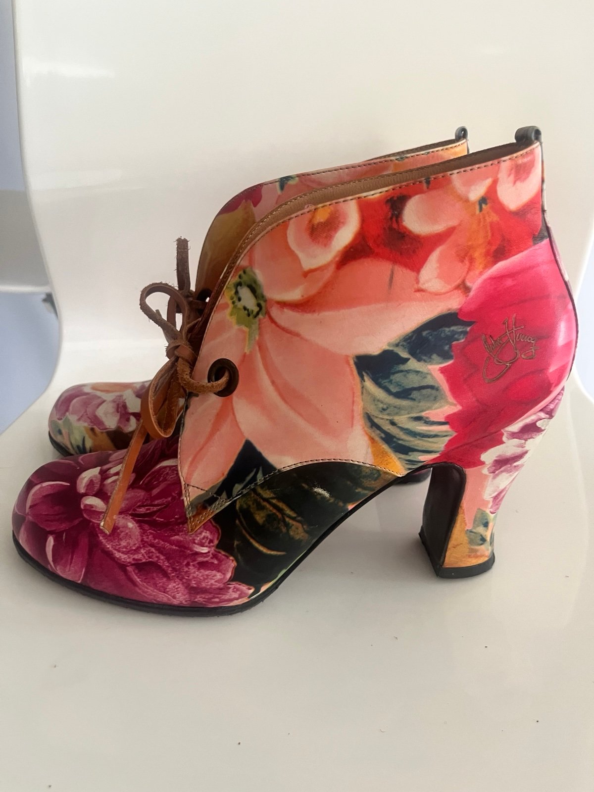 Believing is the hardest obstacle to overcome, especially when you see it with your own eyes. An ankle booty designed with delicate swooping curves upon a hand carved wooden last, one has to wonder if John was experiencing Divine Intervention while drawing these lovely Stunners. Made with love at a Peruvian factory that has a reputation for outstanding quality and craftsmanship, The Stunner features 3.25" heels, oversized eyelets and ribbon lacing as well as leather soles with a rubber tread that will walk your feet down your true path. Practice the Daily Miracle of Giving.
