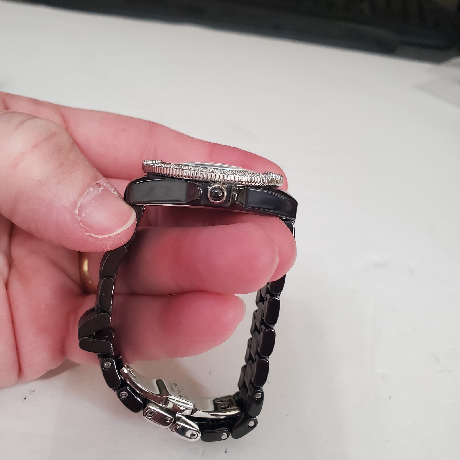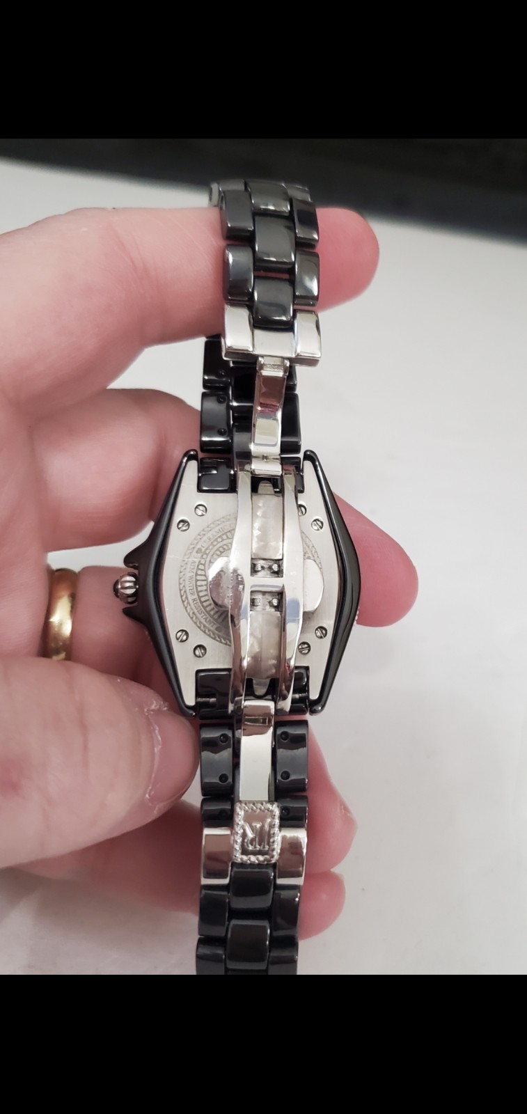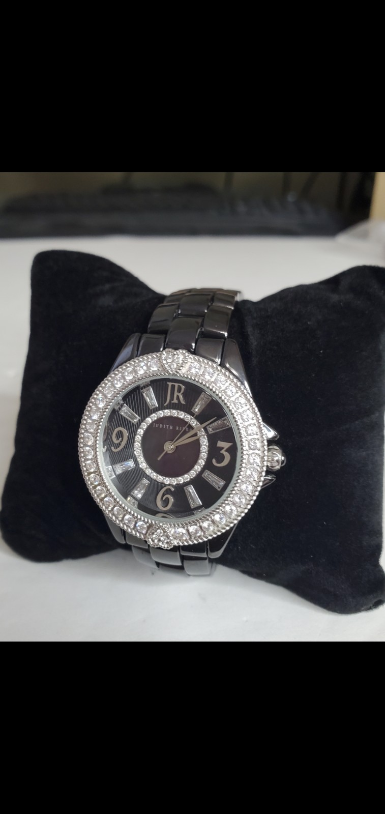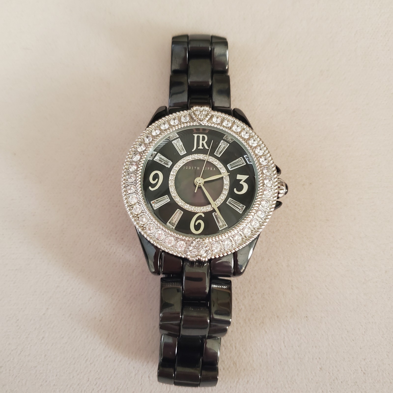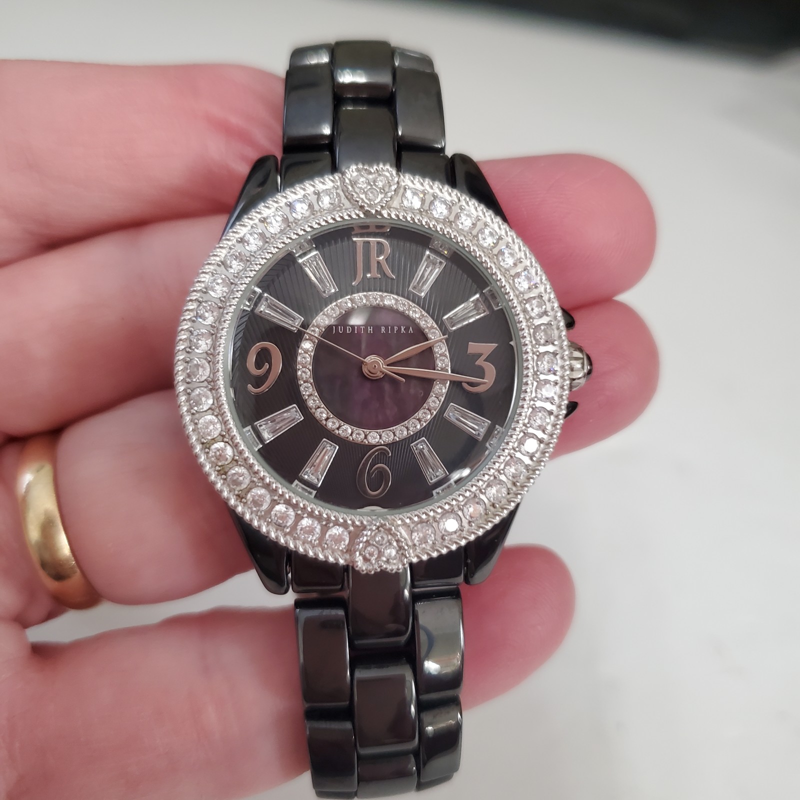 Beautiful Judith Ripka black ceramic and stainless steel watch with diamonique simulated diamonds carat wt 1.6. Abalone face. Arabic numerals at 12, 3, 6, and 9. Diamonique hour markers. Simulated diamonds decorate the bezel along with heart shaped designs at North and South points for a sweet touch.