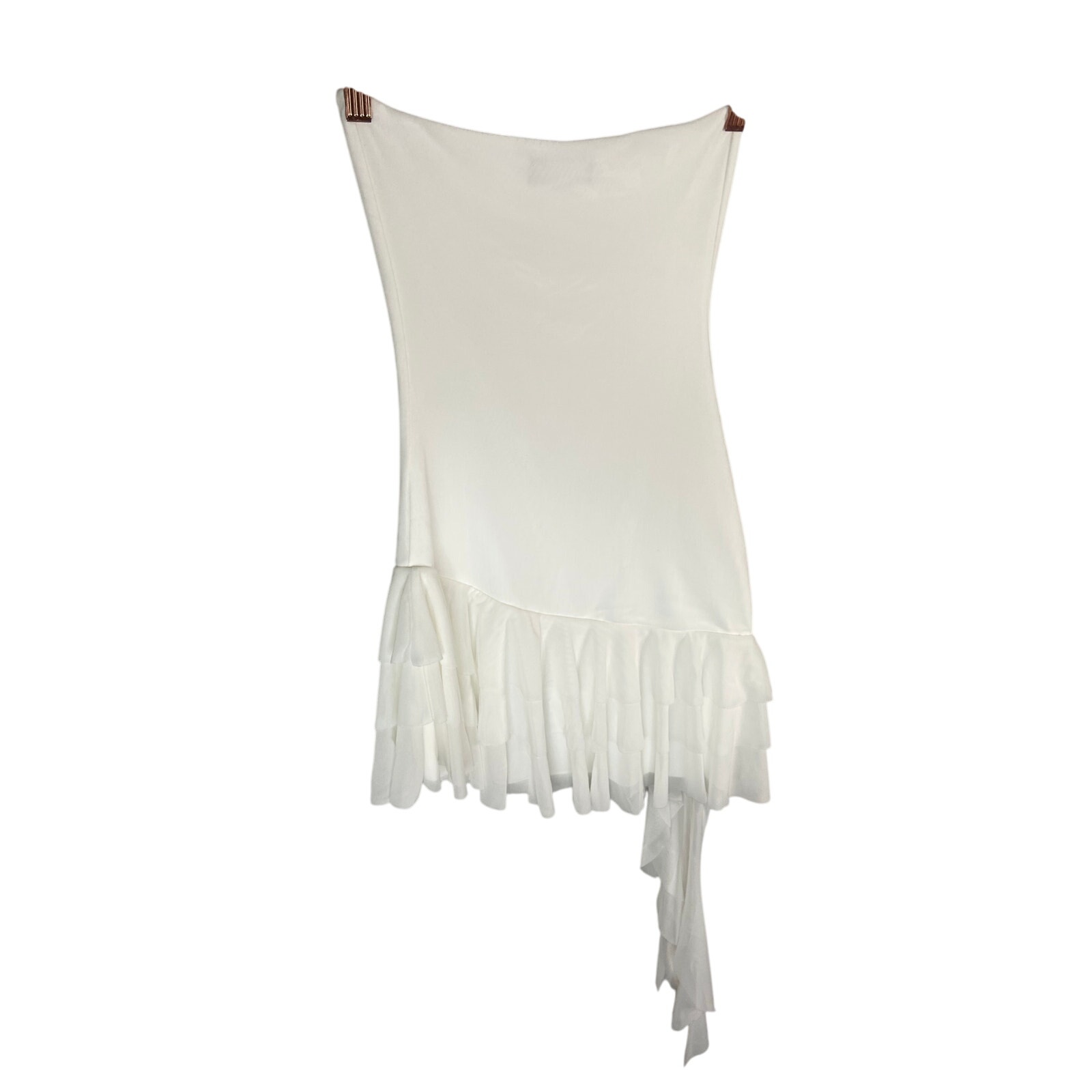 The MAJORELLE Clara Strapless Mini Dress in ivory is a romantic and feminine piece, perfect for special occasions. Crafted from lightweight mesh fabric, it features a ruffle hem and a draped overlay at the side, adding a touch of elegance to its design.