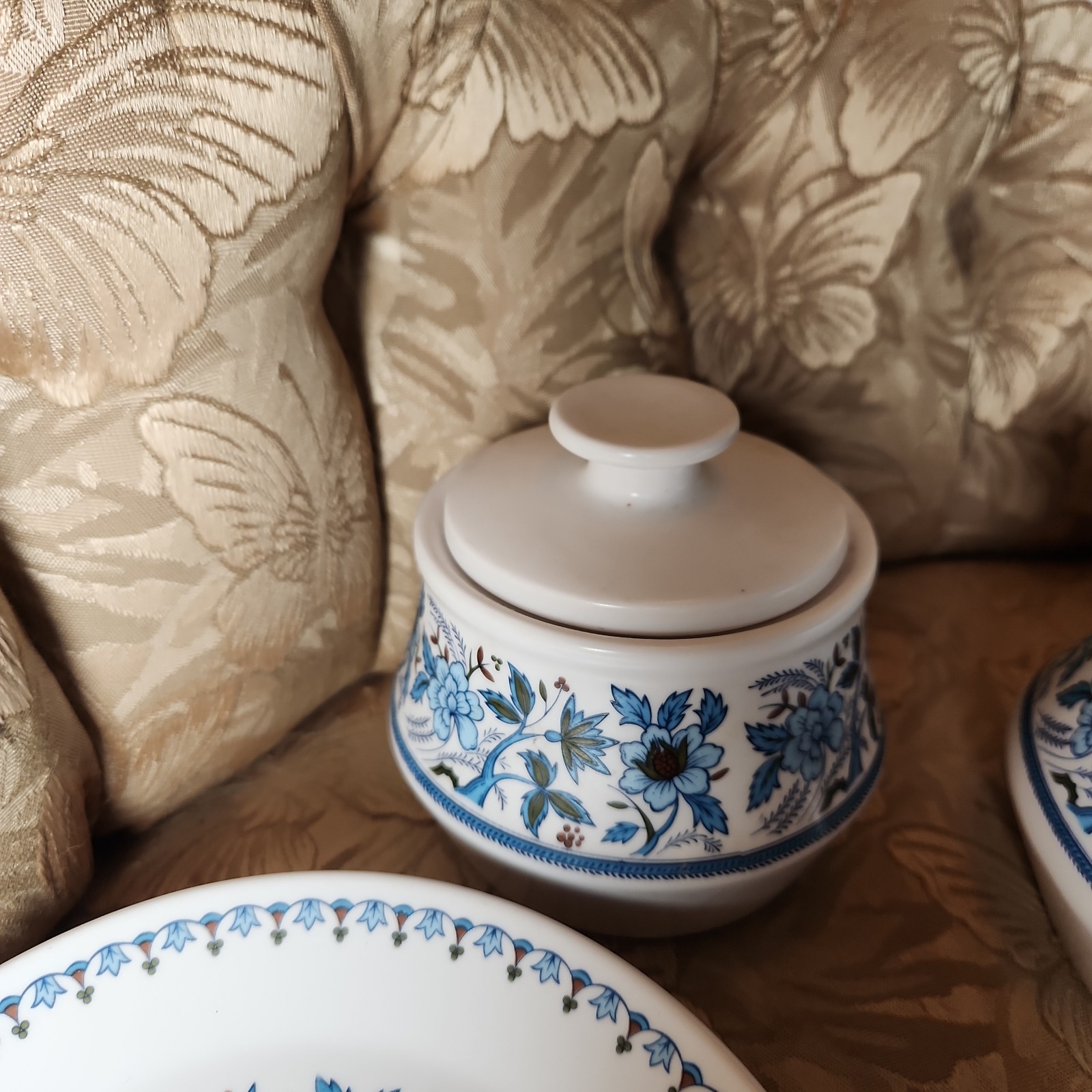 you get this matching set. you get the sugar, Creamer, Gravy Boat and 4 plates that are 6.5" across. no chips or cracks. comes as a complete set, will not seperate.