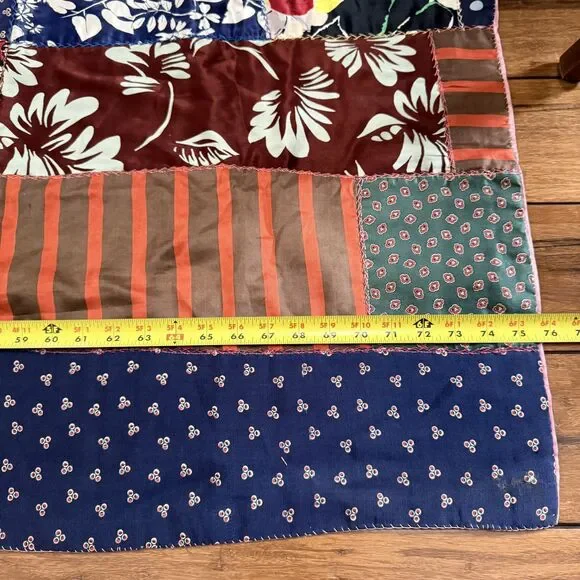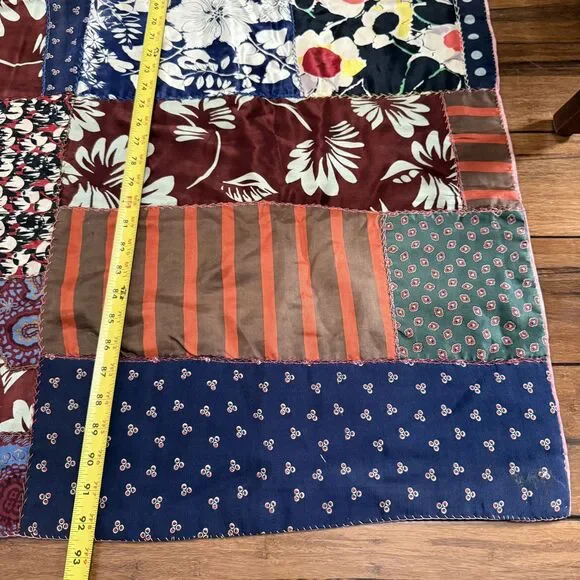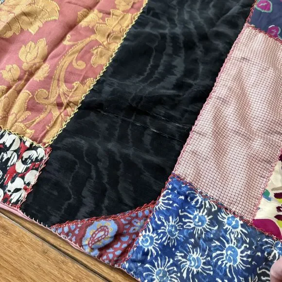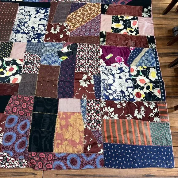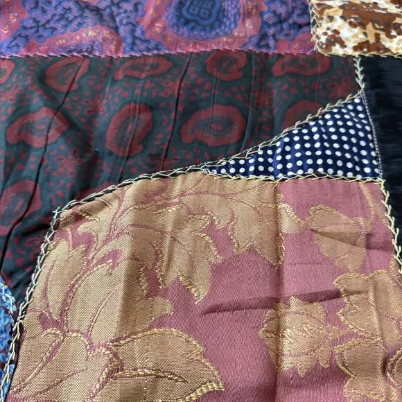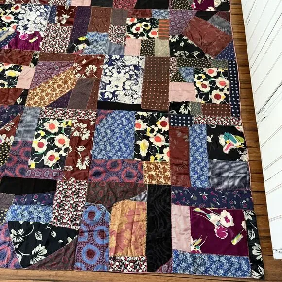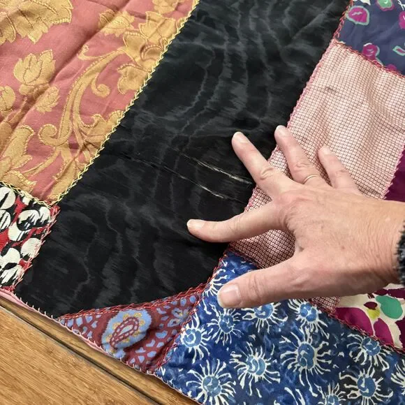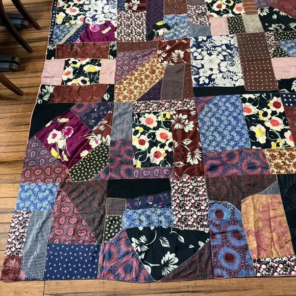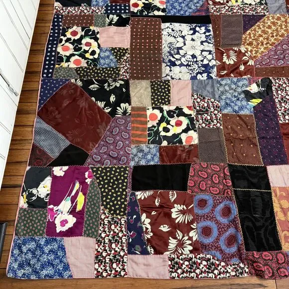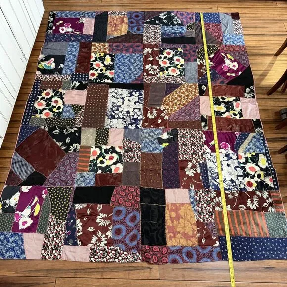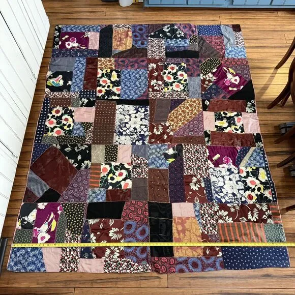 VTG Hand Pieced Embroidered Crazy Quilt 92 X 76 Silk Cotton Boho-Cottage Core.Could be antique but without being sure I did not want to list as such.**READ** Does have a few areas where material is thin and has worn out plus the back has some areas that I believe are probably sun faded.I attempted to show these in photos. There may be a few other areas of thinness that I could have missed. Please use zoom and use your best judgment but considering age it is in pretty darn good condition.PLEASE SEE ALL PHOTOS FOR ACCURATE DESCRIPTION AND MEASUREMENTS.Smoke free. Weight is just under 4 lbs.Thank you for looking!