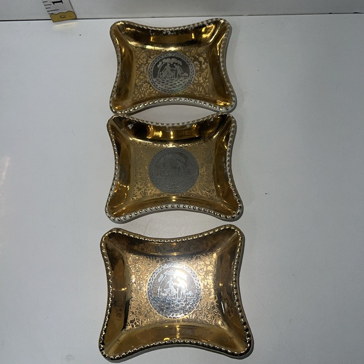 The product is a vintage Le Mieux China ashtray set, featuring three 24K gold encrusted ash trays and a cigarette trinket box.