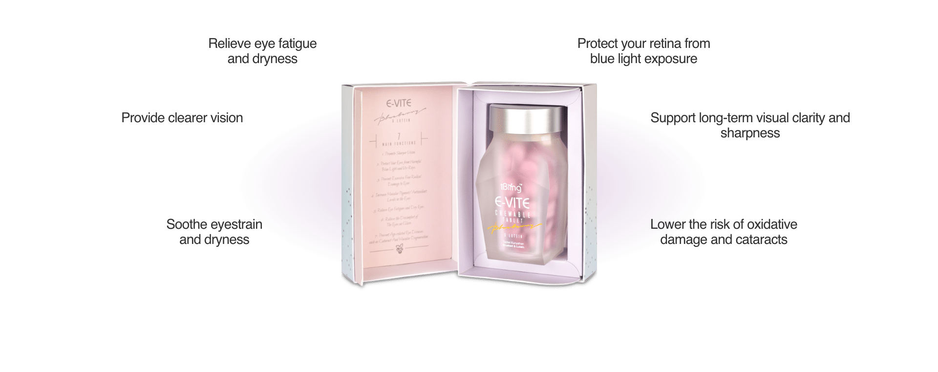 Formulated with a blend of eye-friendly ingredients, E-VITE delivers high antioxidant support to better protect and nourish the eyes.