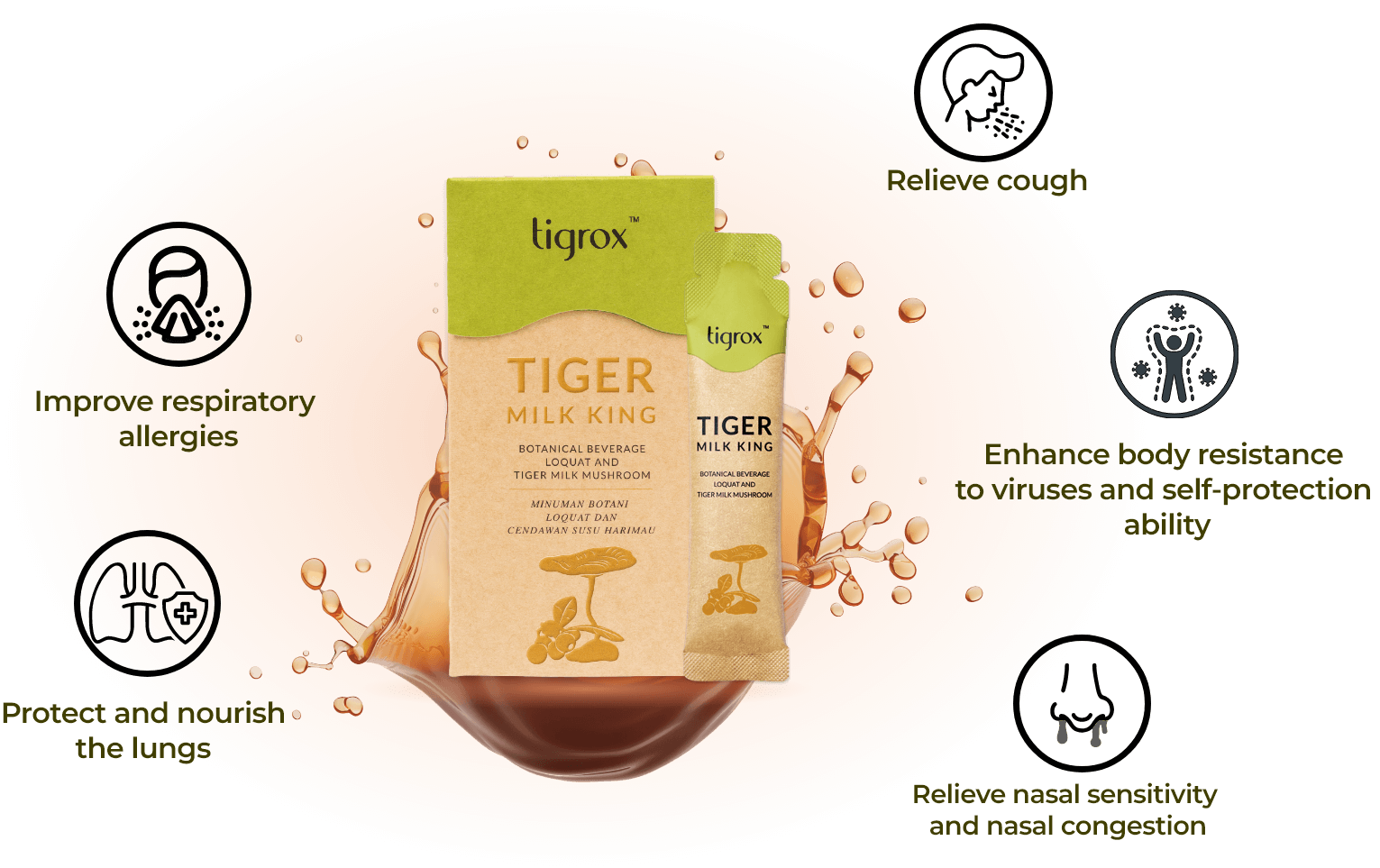 Crafted with premium tiger milk mushroom and a blend of natural ingredients, Tiger Milk King nourishes and protects the lungs. Effectively relieving sinusitis, cough, post-COVID symptoms, and respiratory sensitivities. Enjoyed by adults and children alike, Tiger Milk King comes in delicious loquat and calamansi flavors.
